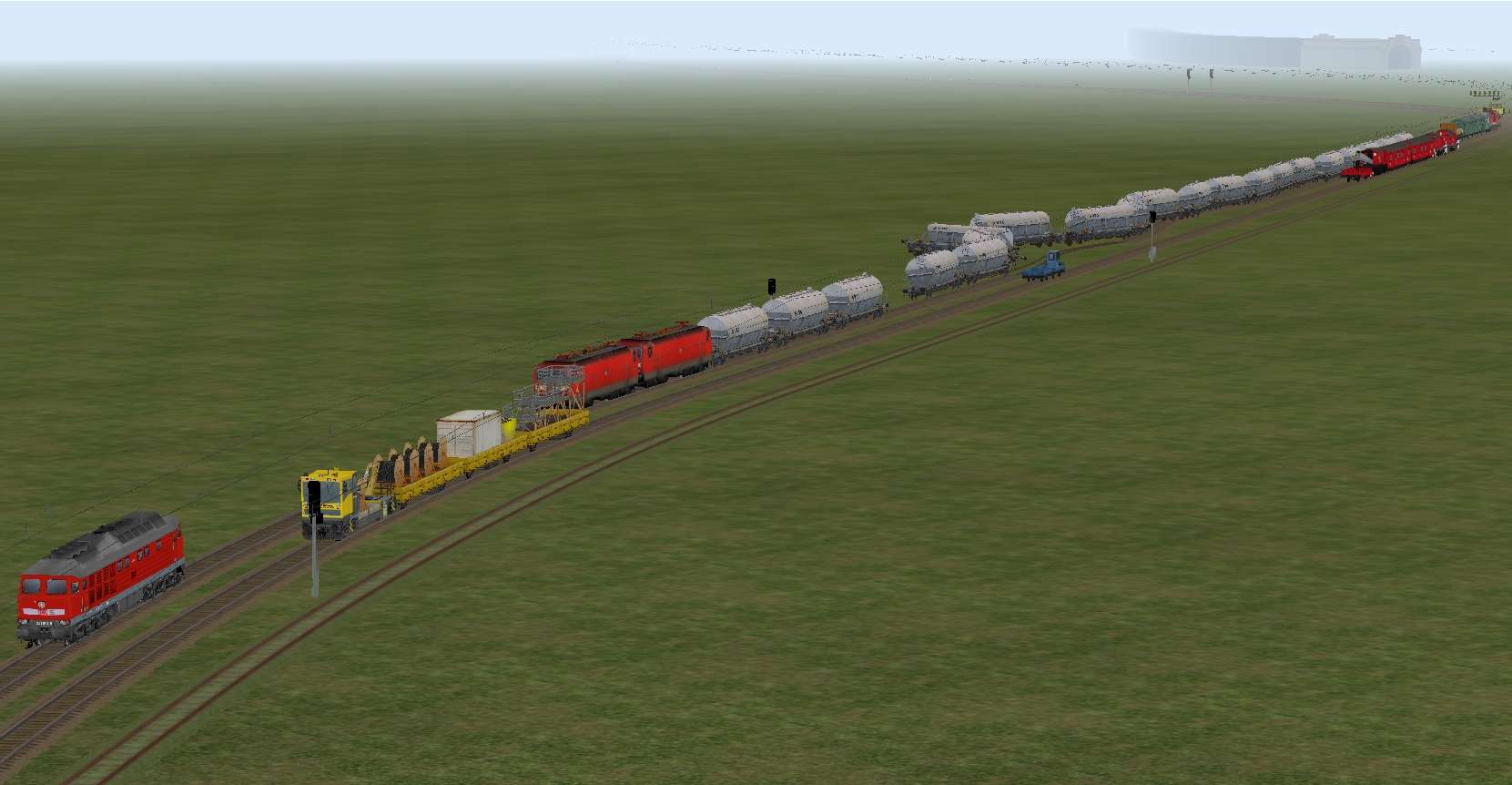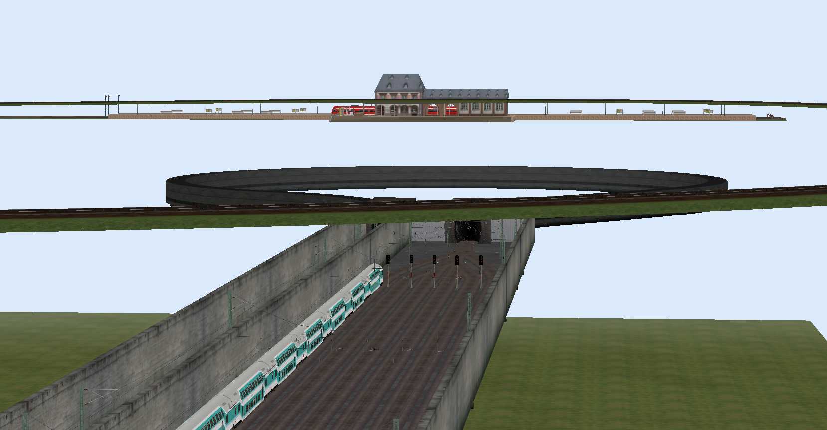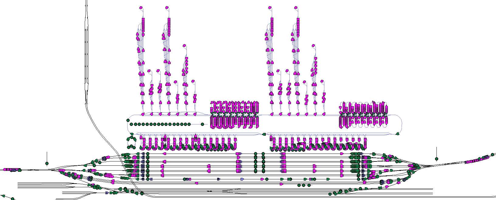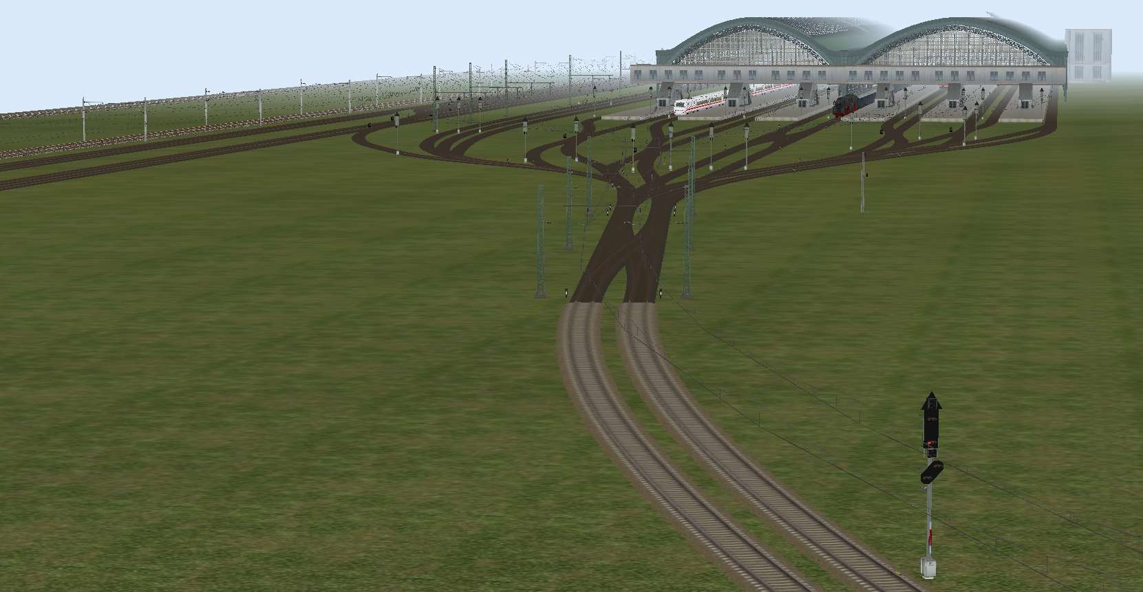 Zu dem Hauptbahnhof gehören noch 3 Gleise für die Umfahrung der Bahnsteige durch Güterzüge und ein kleinerer Rangierbereich.